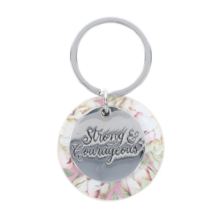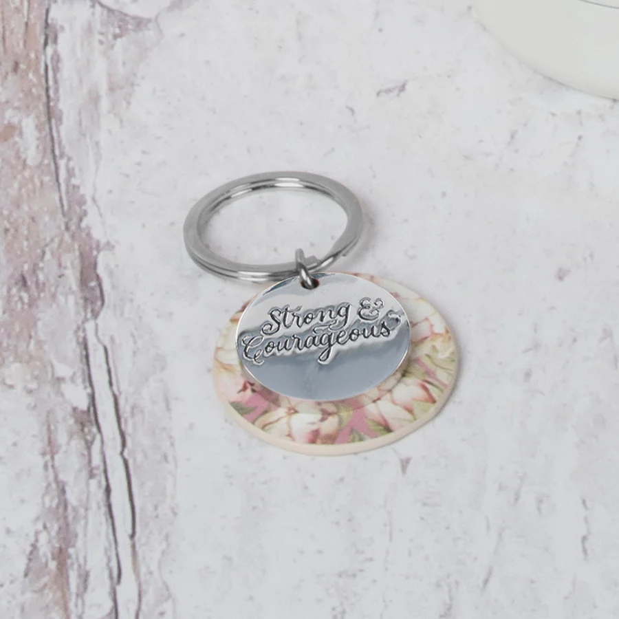 Metal and faux leather key ring with “Strong and Courageous” message.